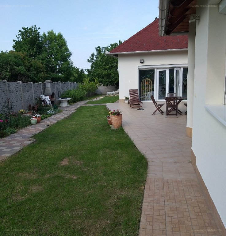 Az alsó szinten találjuk a 100 nm-es nappalit, ami családi, baráti összejövetelek helyszíne is lehet. Egy hosszú, fárasztó nap után felfrissülést nyújt a belső, illetve külső részről is megközelíthető 50 nm-es ellenáramoltatós, fűtött medence. Az 1600 nm-es gondosan ápolt, parkosított udvaron tuják, dísz cserjék, virágok, a hátsókert részen gyümölcsfák találhatók. […]”