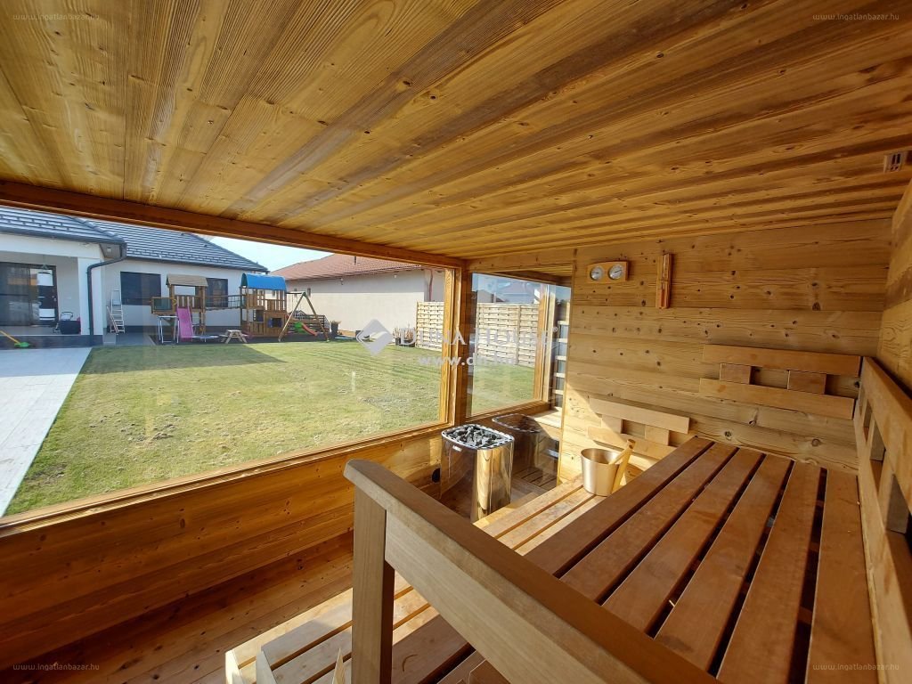 Hatalmas fedett terasz, nyársaló és grillező található a kertben, de az Igazi különlegesség Szolnok ‘Rózsadombján’ a külön épületben található wellness részleg. Itt található finn szauna, só pára befújásra is alkalmas infra szauna, jacuzzi, csobbanó dézsa, pihenő helyiség, és fürdőszoba, az egész épület infra fűtésű. A kertben található teljesen automata, hőszivattyú fűtésű medence polikarbonát fedést kapott, így a fürdési szezon hónapokkal kitolható. A medencében található élmény elemken kívűl, gyermek rész, és úszógép is. Az udvarban található még egy biztonsági padozatra épült modern játszótér. Az egész udvart holland pázsit borítja. […]”