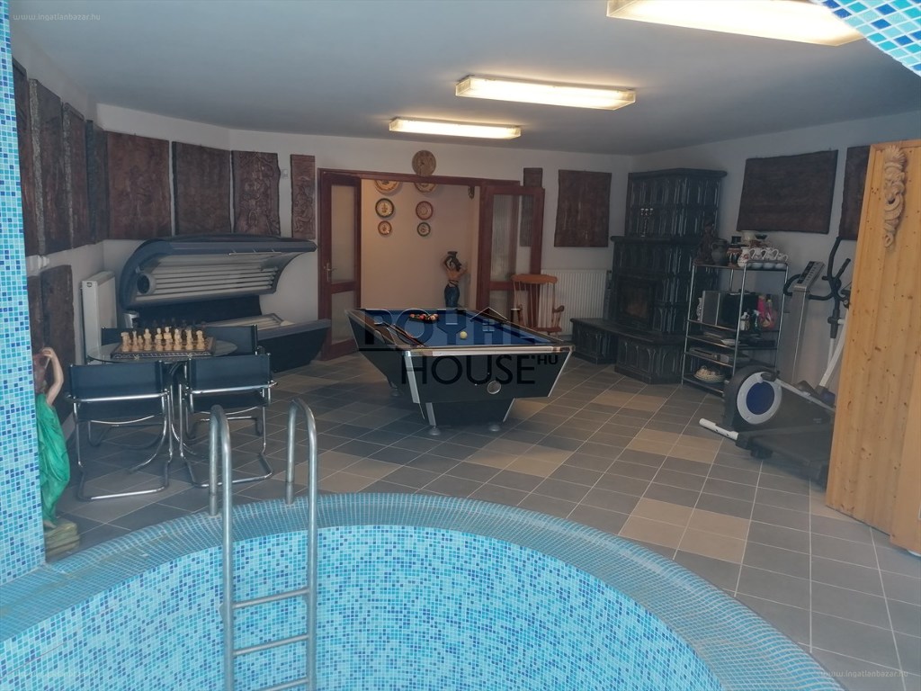 Előtér – közlekedő, mosókonyha, tágas relaxációs helyiség medencével es szaunával. Valamint egy 32 m2-es dupla garázs, amiből az átjárás biztosított. A közvetlen kertkapcsolat és a teraszra való kijutás innen is megoldott.