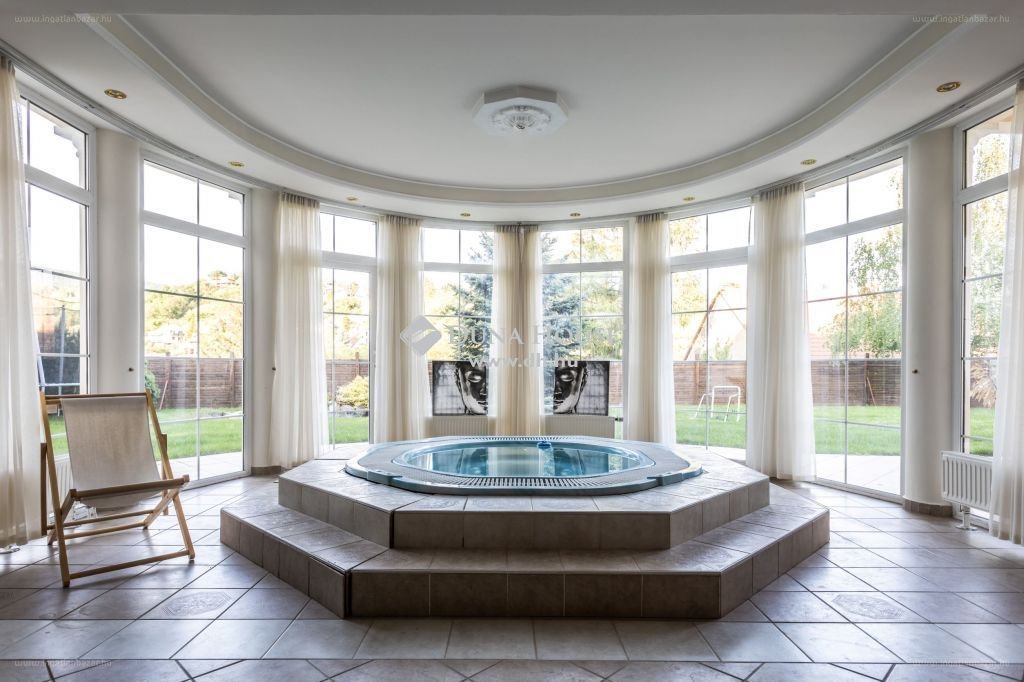 A lakószinten egy 45m2-es lakosztály , melyben egy légtérben egy romantikus kikapcsolódásra alkalmas fürdő-sarok lett kialakítva. Az emeleten 3 háló+ emeleti nappali, fürdőszoba helyezkedik el.Az alsó szinten nagyméretű wellness helység beltéri süllyesztetett panorámás jakuzzival, szaunával edzőteremmel igazi otthoni kikapcsolódásra alkalmas. Dupla garázs, melyből közvetlen a lakószintre jutunk. Sok extrával (automatizált öntözőberendezés kúttal, központi porszívó, távvezérelt zsaluzia , klíma, kültéri medence, wellness stb.). felszerelt , tágas otthon. […].”