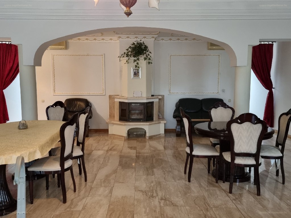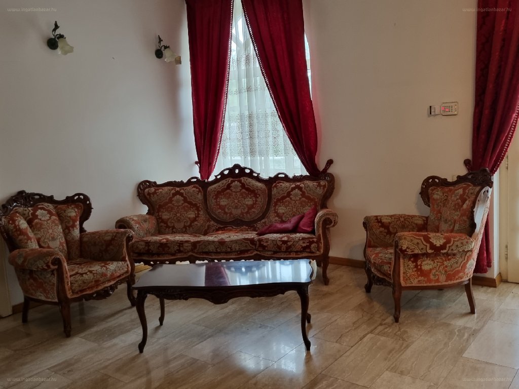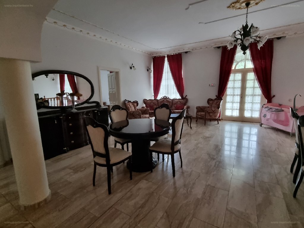 “Cserkeszőlőn  a közkedvelt gyógyfürdő szomszédságában eladóvá vált ez az exkluzív, minden igényt kielégítő kúria! Az ingatlan vételára tartalmazza a benne található nem mindennapi szépségű barokk stílusú bútorokat! Az 1050 m2-es telken lévő  440 m2 területű  épület (ebből a terasz 80m2) belső két szintes , 4 bejárattal. A felső szinten van 2 konyha, 4 hálószoba mindegyik saját  fürdőszobával,  2 WC, és a központi helyiség, egy hatalmas nappali a kert felé néző terasz kapcsolattal. Igényes, berendezése egységet képez, stílusban , színben  minden harmonizál. A képek magukért beszélnek!