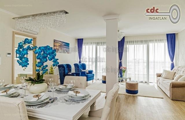 “Siófok ezüstpartján a jacht- kikötőtől pár perc sétára, megújuló környezetben, a Liszt Ferenc sétányon, a Cirkáló Társasház legfelső, 9. emeletén, közvetlen Balaton parti, Balatonra néző, luxus szinten berendezett, vadonatúj, amerikai konyhás nappali + három külön bejáratú hálószobás, két fürdőszobás, külön wc, 46.2 m2 -es teraszos, hatalmas ablakos, világos 112,6 m2 -es, ÖRÖKPANORÁMÁS, PENTHOUSE lakás eladó.