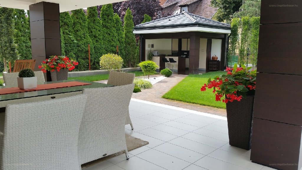 – kertben mindennel felszerelt grillkonyha, értékes növényekkel telepített kert, automata öntözőrendszer stb.,