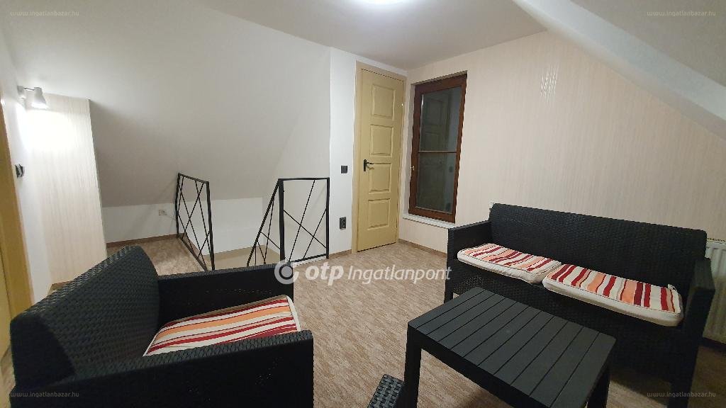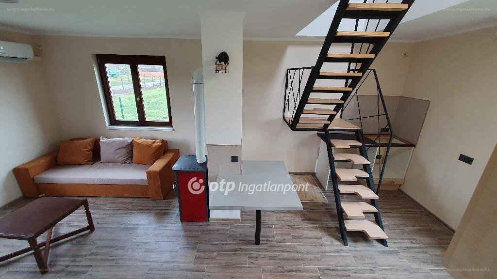 A nappaliból induló egyedi lépcső feljáró a hely adottságaihoz képest,kényelmes közlekedést biztosít. A korlát szerelhetősége a bútorok felvitelében akadálymentesít. A tetőtérben két szoba és mosdó WC-vel helyezkedik el. Az ingatlan részben bútorozott, konyhapulttal ellátott. Napfényes, minden oldalról ablakokat építettet be,így a természetes fény kitűnően bevilágítja. A nyári melegben, egy inverteres klíma állítja elő a kellemes hőmérsékletet, mely a fűtésre is rásegíthet. […]”