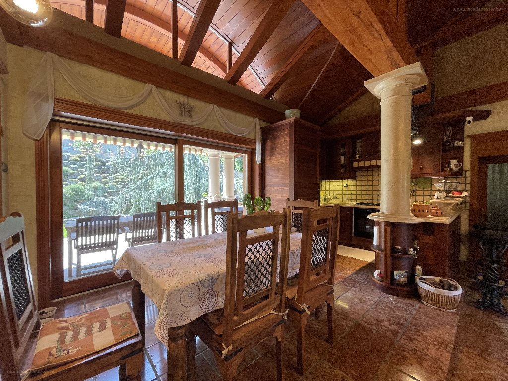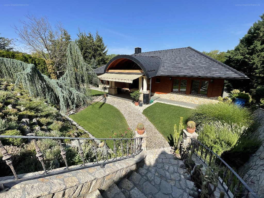 “Átgondoltan és precízen megépített családi ház várja új lakóit, igazán jó energiájú, maximális intimitást biztosító, zöld környezetben. Mintha egy mesevilágba csöppennénk. A ház egy építészeti remekmű, melyhez tökéletesen illeszkedik a kert csodavilága, teraszos kialakítású elrendezéssel, örökzöld sziklakerti növényekkel, sövényekkel, hatalmas fákkal. 2179 m2-es telken, 2004-ben épült meg ez a – tulajdonosai által megálmodott – elegáns otthon, melynek 152 m2-es földszintjén egy hatalmas – 68 m2 alapterületű, 5 méter(!) belmagasságú – nappali kapott helyet, valamint 4 hálószoba, fürdő és wc helyiség. A 151 m2-es pinceszinten szauna és fitnesz szoba, illetve társalgó, tároló és háztartási helyiségek kerültek kialakításra. (A pinceszint különlegessége, hogy télen-nyáron – fűtés nélkül! – állandó hőmérsékletet tart.)”