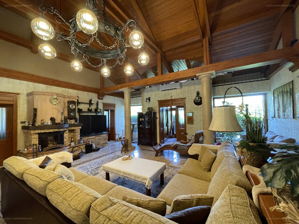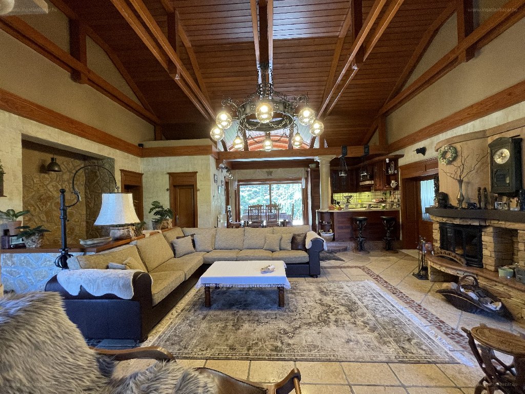 Ez egy igazi otthon, ahol a ház belső, monumentális terei, a fa és kő mindent átható elemei megnyugtatják és ellazítják az ide érkezőket. Ugyanezt kapjuk az udvaron is, ahol a sok-sok örökzöld, a gondozott pázsit (automata öntöző-rendszerrel locsolt) és a medence a teljes kikapcsolódás lehetőségét nyújtja. Külön erénye a teleknek, hogy maximális intimitást biztosít -ide kíváncsi szemek nem tévedhetnek. A szépen kialakított, hűs borospince a barátaink kedvenc helye lehet. Az autók számára 3 beállásos fedett beálló, valamint egy dupla garázs áll rendelkezésre. […]”