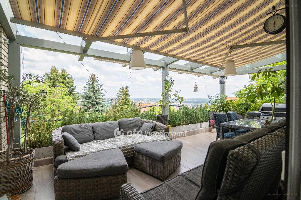 “Pécsett a Makár felett megvételre kínáljuk ezt a páratlan mecseki panorámával rendelkező és finom eleganciával kialakított álomotthont. A lakóházat egy 1069 m2 nagyságú parkosított, gondosan megtervezett kert veszi körül. Az épület 3 szintes, összesen 242 m2 alapterületű, kiváló elrendezésű. Az alsó szinten 3 állásos garázs, konditerem, mosókonyha, tároló kapott helyet. A középső szinten található a minden igényt kielégítő konyha, kellemes hangulatú étkező és nappali, WC, egy hangulatos, szaunával ellátott fürdőszoba, egy gardróbszoba, valamint a kb. 35 m2 nagyságú fedett terasz, melyről Pécs városa, a TV torony és a Székesegyház látványa tárul elénk.