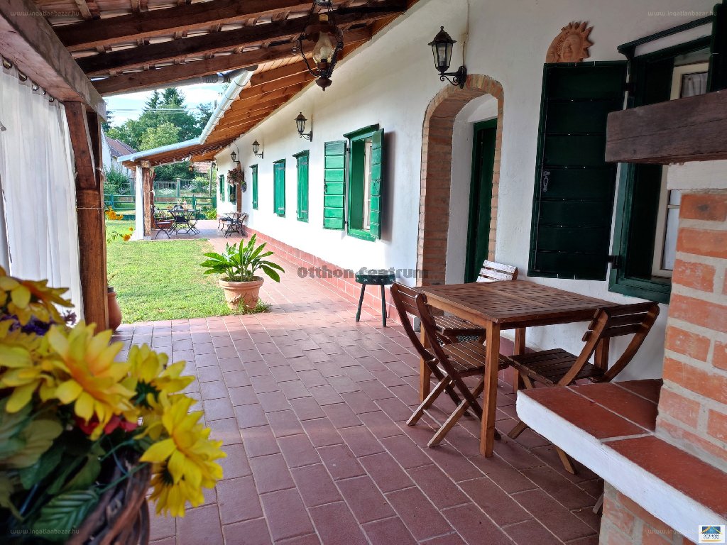 A tető 2 éve lett felújítva, víz- villany vezetékek cserélve lettek, a ház új, stílusos nyílászárókat kapott. Első fele új, fedett tornácos részében 2 terasz lett kialakítva, ahol egy kemence is helyet kapott. Ez a rész Toscana stílusú térkövezettel burkolt. Az ingatlanhoz tartozik még egy nagy garázs, ami jelenleg szerszámos tárolónak van használva. Az ingatlanban be van vezetve a gáz, de mivel a tulajdonosok ezt a házat csak nyáron használják, ezért egyedül a nappaliban lett elhelyezve egy vegyes tüzelésű kályha. A rendezett, letisztult, sík telken gyümölcsfák vannak, a telek gazdálkodásra is alkalmas azok számára, akik nyugodt, önfenntartó életre vágynak. […]”