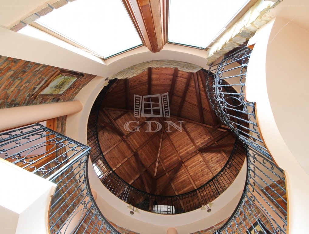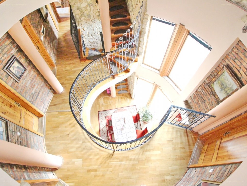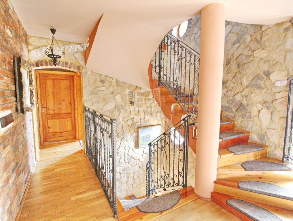 Az egyedi elképzelések alapján készült, Makovecz jegyeket mutató, átriumos főépületben az organikus elemek és a fém egyensúlyát, nagy felületű, modern nyílászárók egészítik ki. Így a nap átjárja a teljes házat. A térrendezés optimális, a fogadószinten nappali-amerikai konyha, étkező található és innen juthatunk ki a hátsó teraszra. Valamint a tágas, fűtött garázsba. Amíg az emeleti lakószinten 4 hálószoba, 2 fürdőszoba található, addig a 3. ún. szabadidő szinten további 2 szoba úgy is kialakítható. Úgy, hogy a 3. fürdőszoba és a fitnesz sarok érintetlen marad. […]”