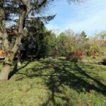 Az 1134 m2-es telek gyönyörűen parkosított, tele gyümölcsfákkal, fenyőkkel és dísznövényekkel.