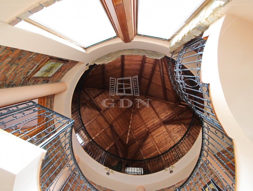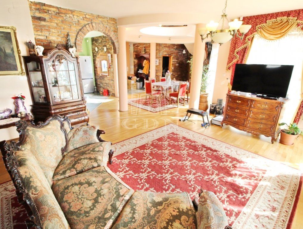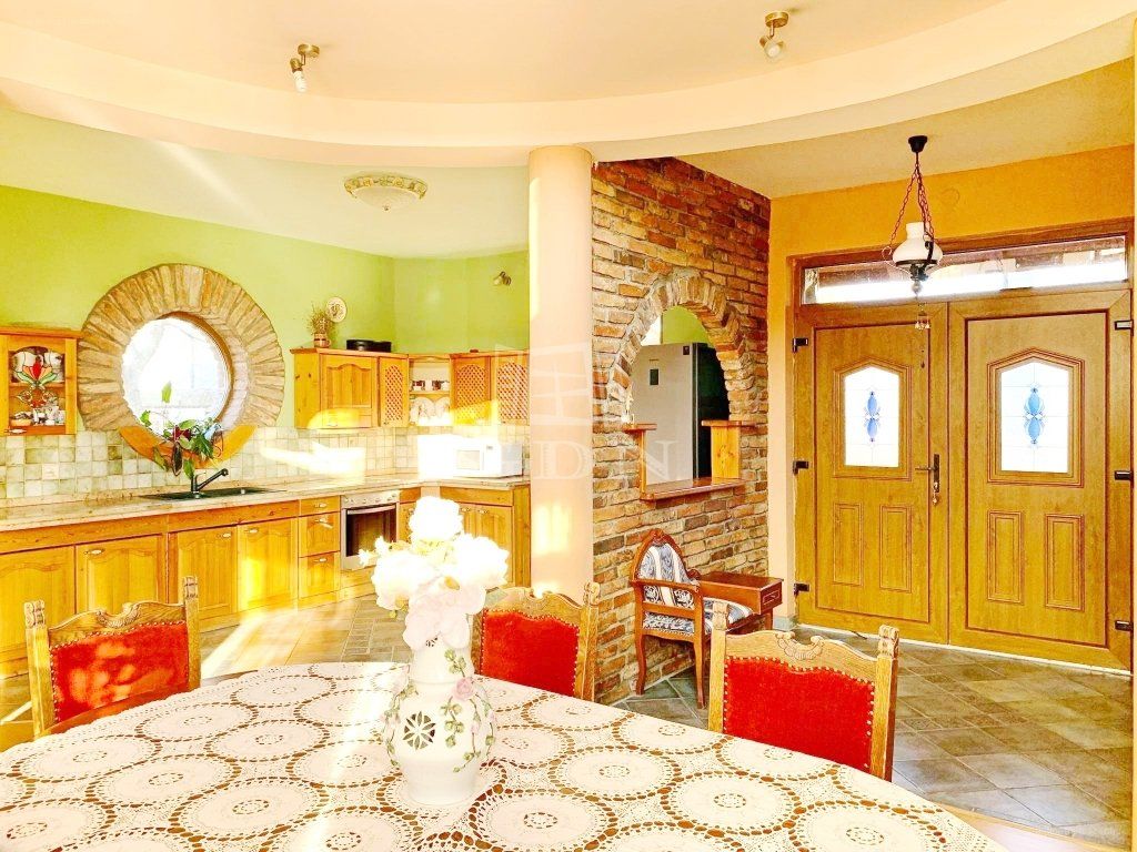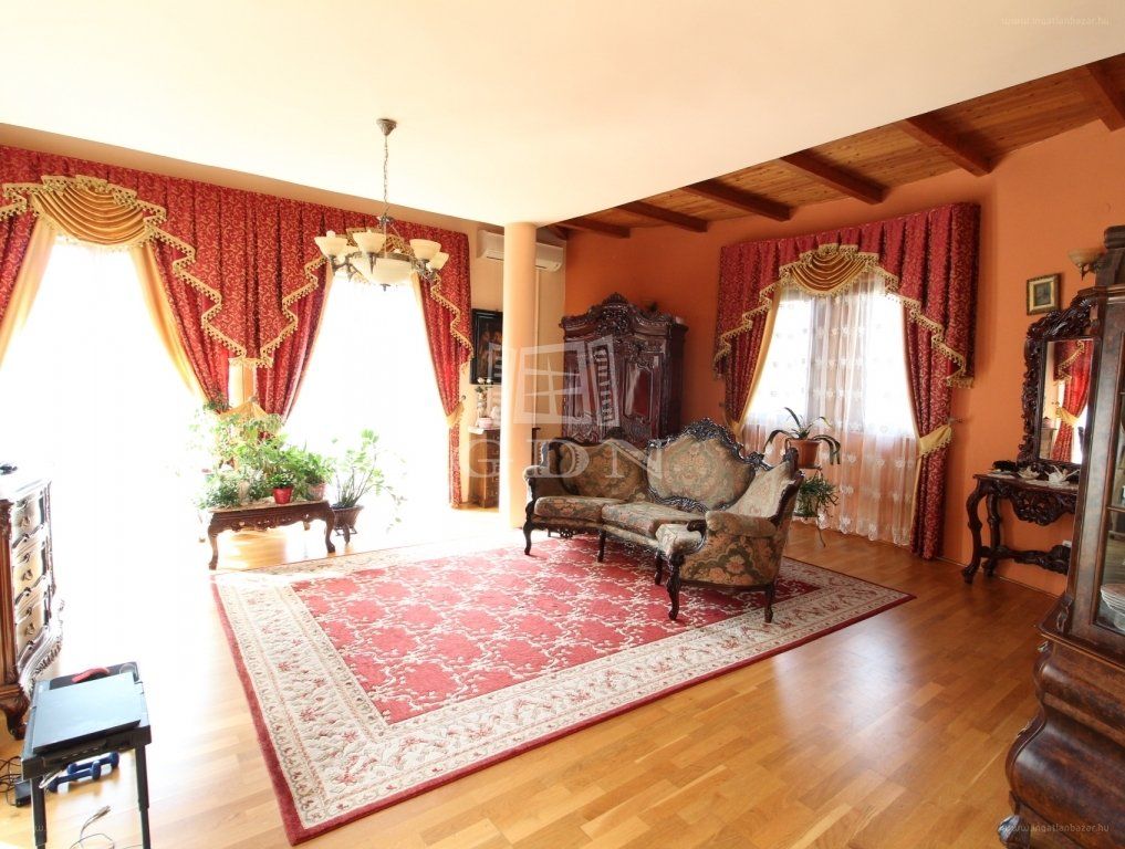 Az egyedi elképzelések alapján készült, Makovecz jegyeket mutató, átriumos főépületben az organikus elemek és a fém egyensúlyát, nagy felületű, modern nyílászárók egészítik ki. Így a nap átjárja a teljes házat. A térrendezés optimális. A fogadószinten nappali-amerikai konyha, étkező található. Innen juthatunk ki a hátsó teraszra valamint a tágas, fűtött garázsba. [...]”